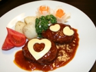 <献立>煮込みハンバーグ、添え野菜、バターライス、チンゲンサイのスープ、クイックケーキ